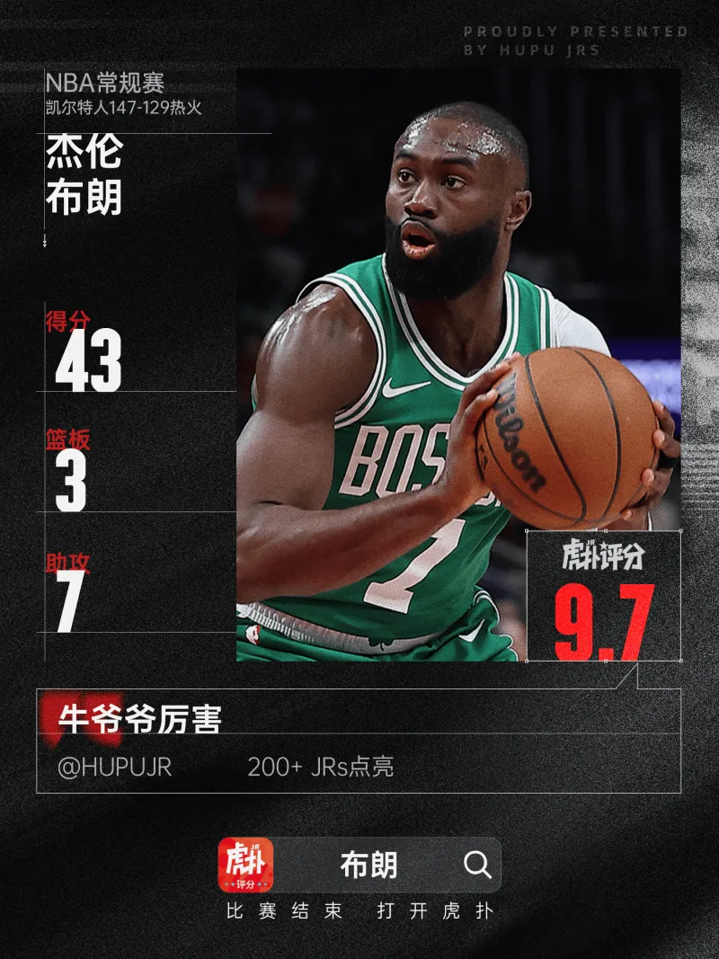 杰伦布朗全场表现亮眼,29投17中拿下43分4篮板7助攻