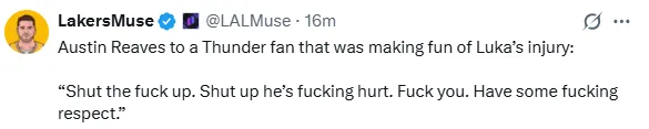 湖人媒体LakersMuse更新社媒:“当东契奇受伤倒地时,里夫斯对一位嘲笑东契奇受伤的雷霆球迷说:“闭嘴!闭嘴!他受伤了!有点尊重好吗?“”