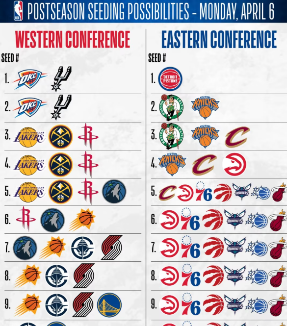 北京时间4月7日,NBA常规赛收官阶段,季后赛排名争夺激烈。联盟官方详解最终排名:仅活塞锁定排位,湖人最好第三最差第五,勇士大概率西部第十。