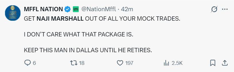 这场比赛后,独行侠媒体MFFL NATION,他写道:把马绍尔从你们所有的交易模拟中剔除吧,我不在乎你们愿意拿出什么筹码,我们想把他留在达拉斯直到他退休为止。