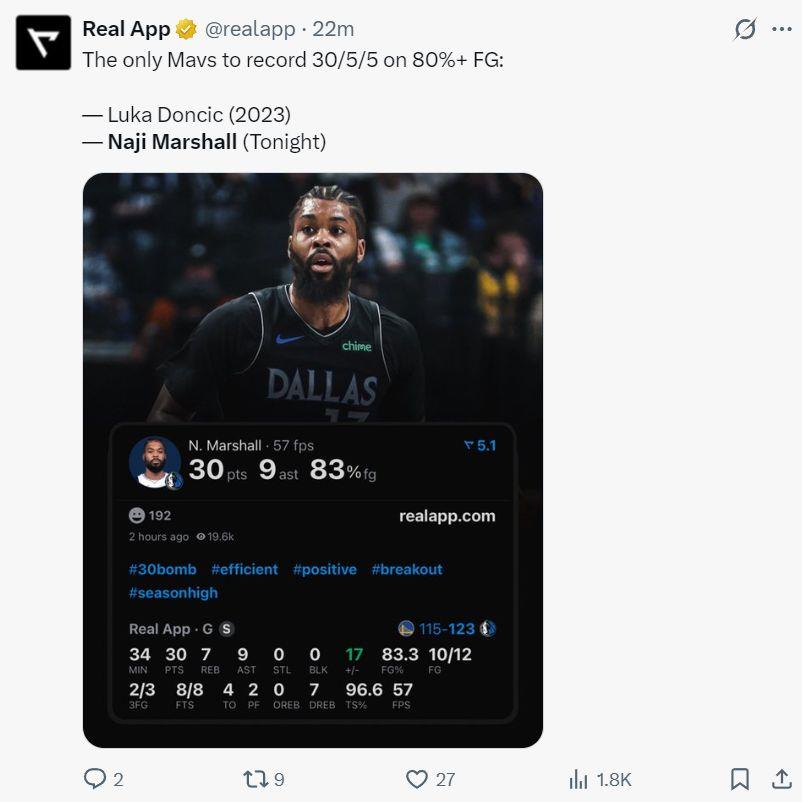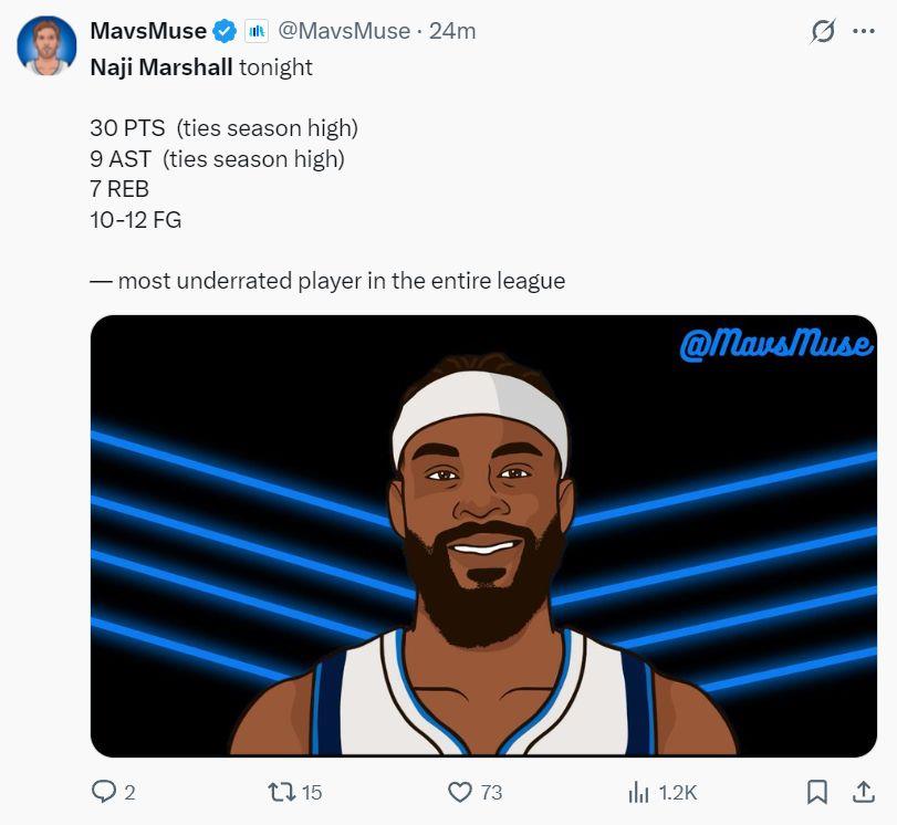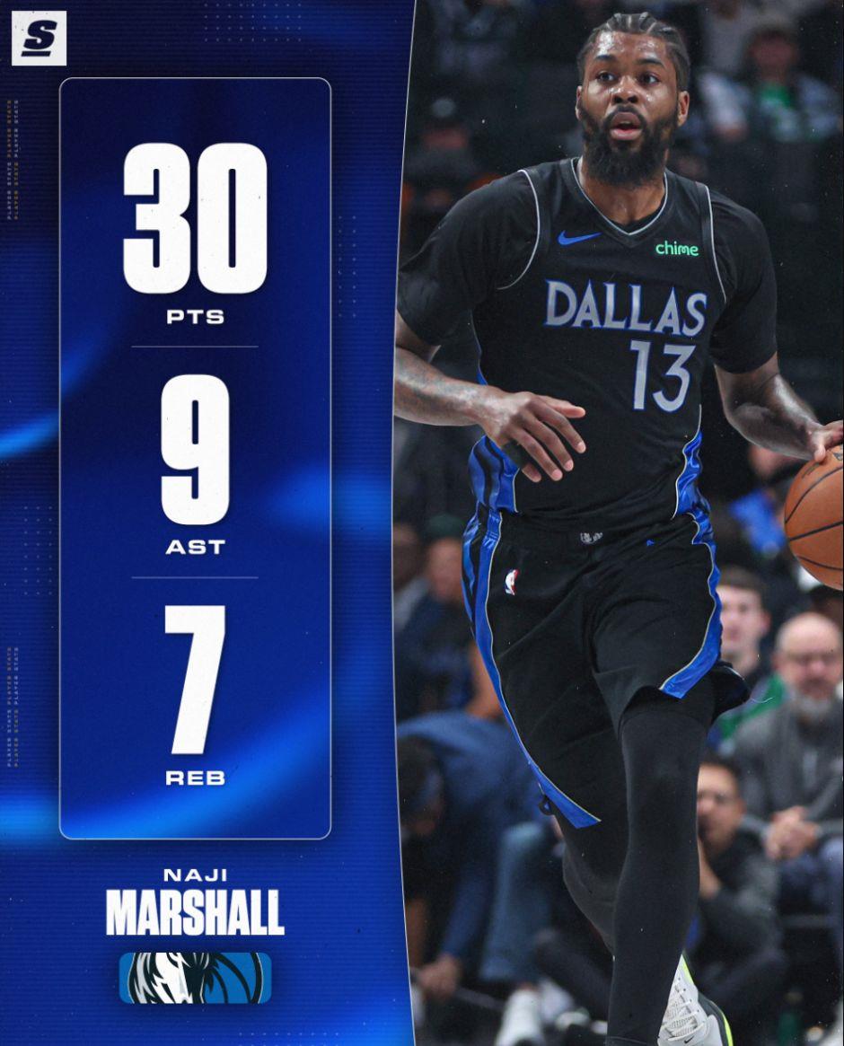 NBA记者马克-斯坦恩:都说联盟的侧翼越来越少,但独行侠的马绍尔表现越来越出色了。
