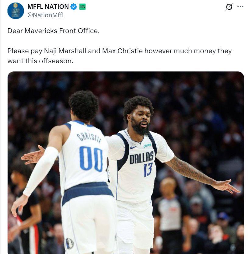 独行侠媒体MFFL写道:这个夏天独行侠应该给马绍尔、克里斯蒂两人他们应得的合同。