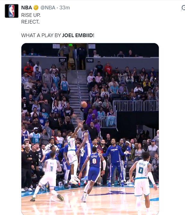 这场比赛黄蜂在主场一度领先15分,可在末节费城已经抹平了分差,进入最后8分钟两队开始进入僵持阶段,终场前31秒马克西两罚一中后费城已经领先3分,终场前19秒鲍尔三分不中,黄蜂前场篮板后,布兰登-米勒在终场前7秒出手底角三分,恩比德从斜侧里杀出完成制胜封盖。