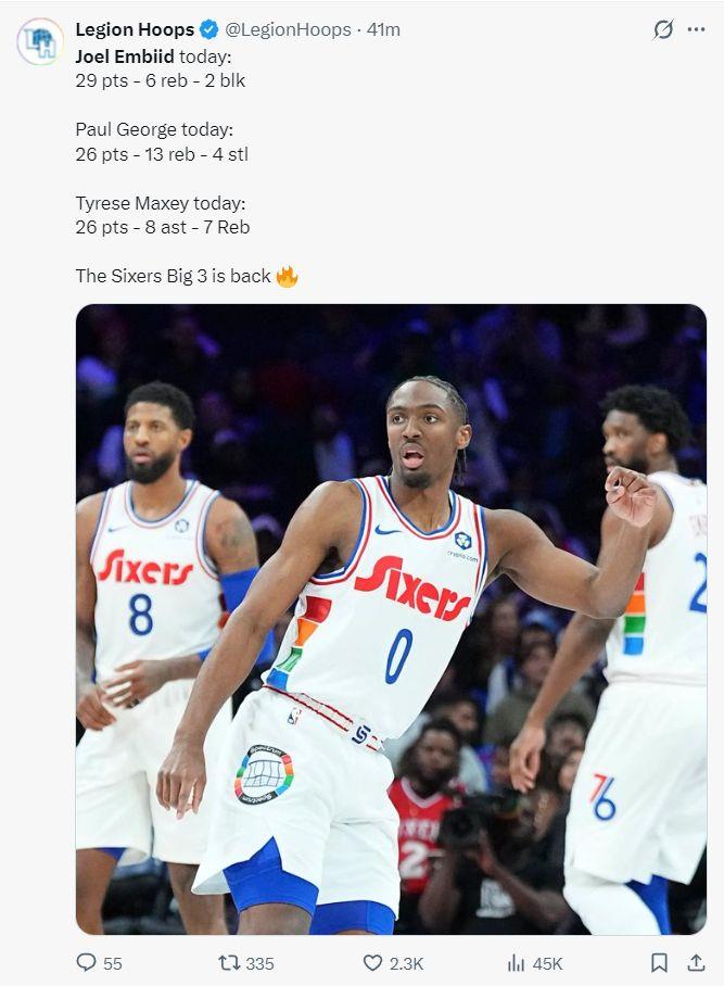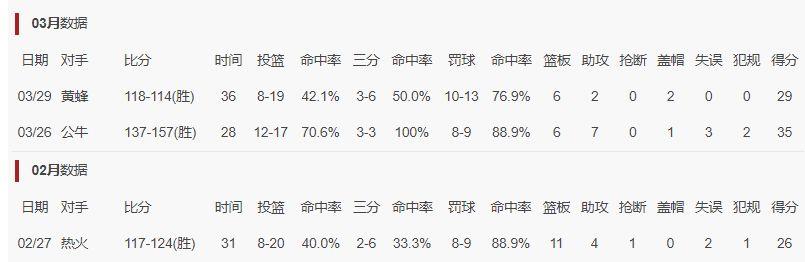 恩比德自3月26日复出以来,对阵公牛17中12 三分3中3,拿到35分7助攻6篮板1盖帽,命中率70.6%,三分命中率100%;