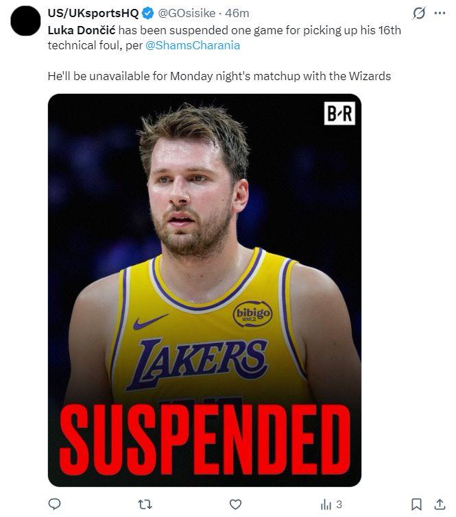北京时间3月29日,NBA官方宣布,因为卢卡-东契奇累计16次技术犯规,将自动禁赛一场,湖人下一场对阵奇才的比赛无法出战。