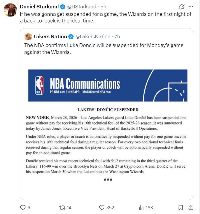 湖人记者Daniel Starkand认为,如果东契奇非得被禁赛一场,那么和奇才这场是再理想不过的时机,而且是背靠背的第一场。