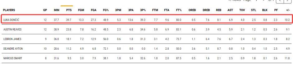 湖人最近12场比赛拿到11场胜利,期间东契奇场均37.7分钟,拿到39.7分8.1篮板6.9助攻2.5抢断,命中率49%、三分命中率39%、罚球命中率80%,真实命中率63%,正负值为 122。