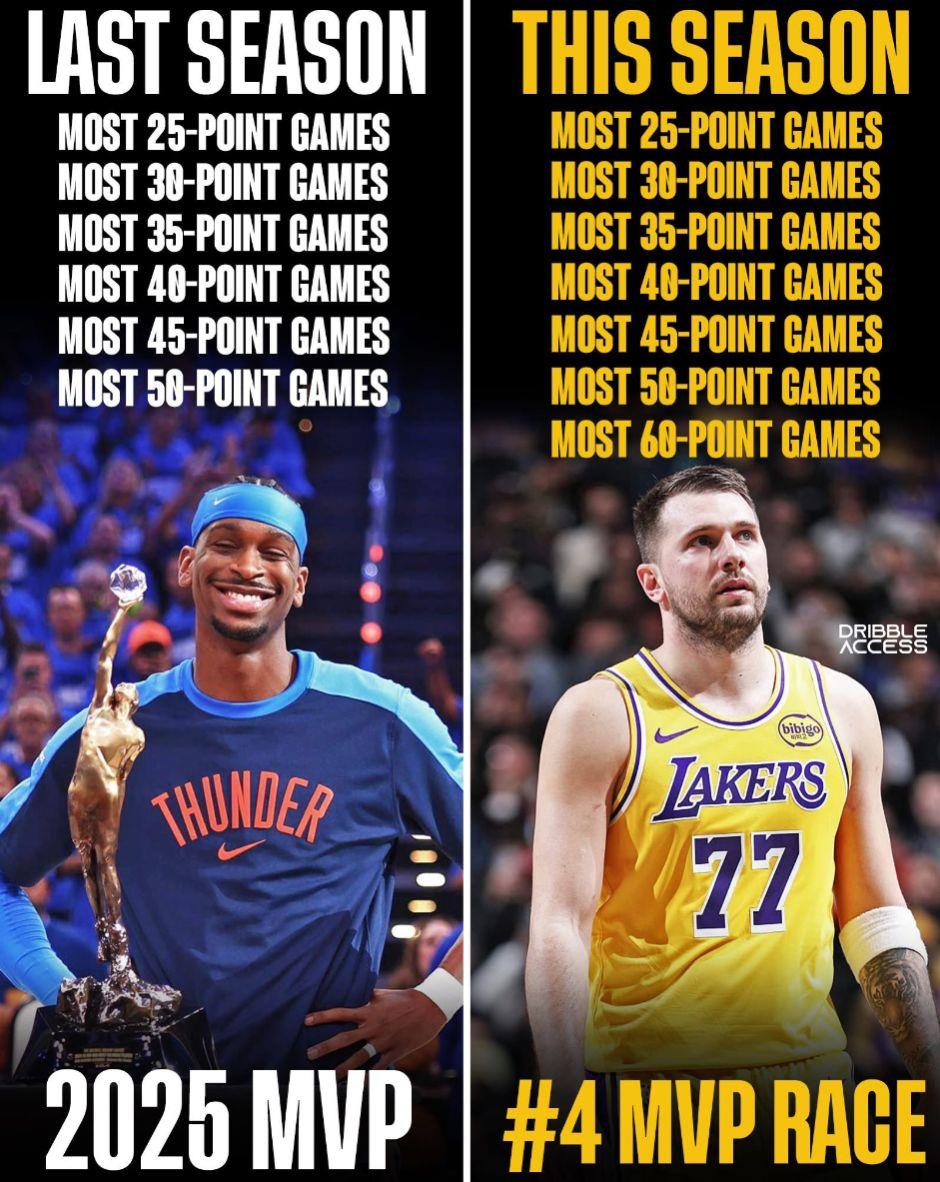 东契奇更是包揽25-26赛季从25分-60分的所有榜单,去年包揽这份榜单的人是SGA他最终拿到MVP,本赛季的东契奇包揽这份榜单MVP仅仅排名第四。