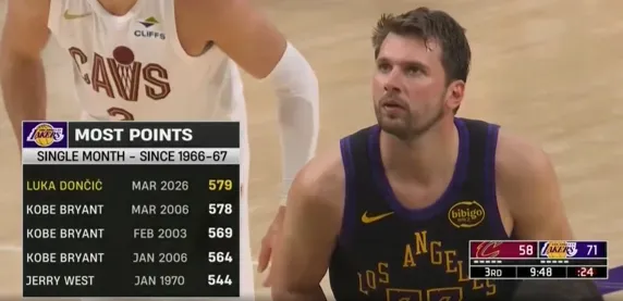 这样一来,东契奇三月得到600分&超越科比的578分,独居湖人队史单月总得分榜第一位。