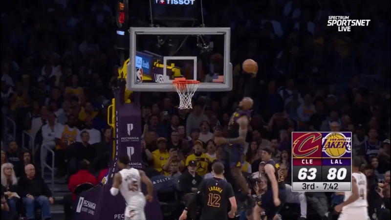 比赛第三节,里夫斯反击轻巧一抛,詹姆斯高高跃起炸裂劈扣。