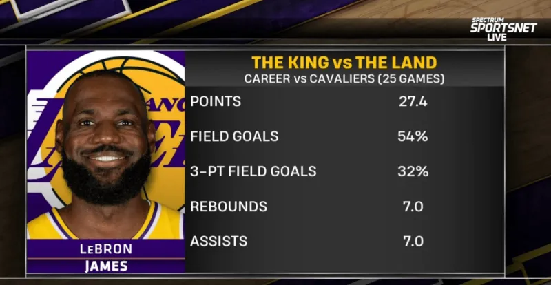 詹姆斯生涯对阵骑士25场比赛,场均拿到27.4分7篮板7助攻,投篮命中率54%、三分命中率32%。