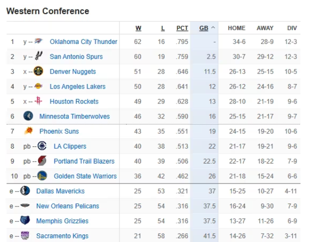 7-10名:太阳(43胜25负)、快船(40胜38负)、开拓者(40胜39负)和勇士(36胜42负)