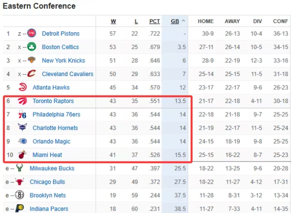 7-10名:76人(43胜36负)、黄蜂(43胜36负)、魔术(43胜36负)和热火(41胜37负)