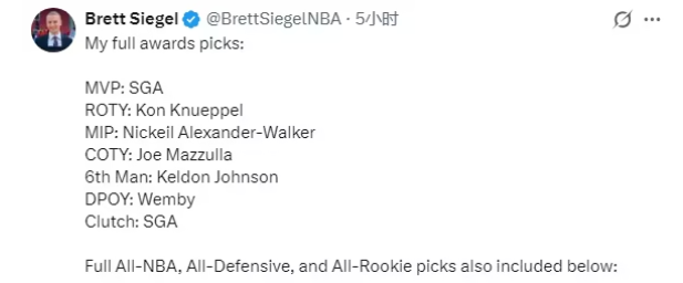 ClutchPoints名记Brett Siegel晒出了自己本赛季常规赛各大奖项投票详情,具体情况如下——