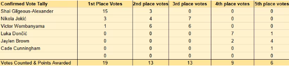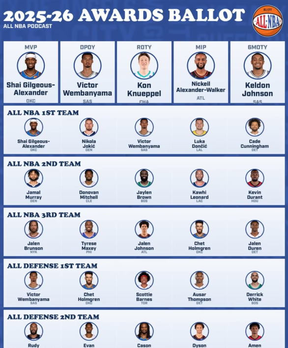 名记晒奖项投票:亚历山大MVP,东契奇获奖,文班DPOY 双一阵