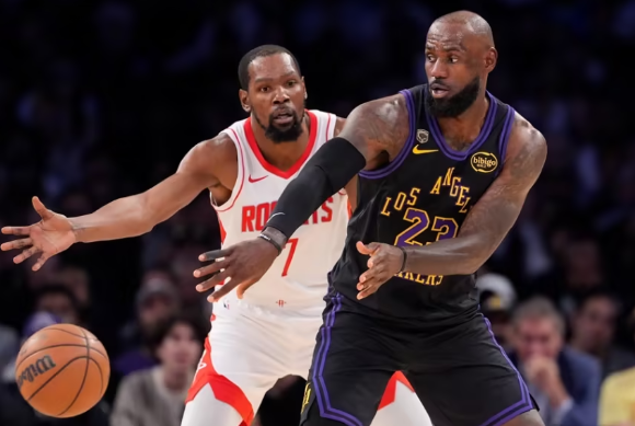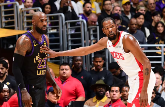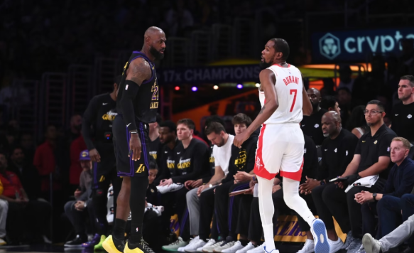 北京时间4月22日,NBA季后赛首轮G2,湖人主场对阵火箭。37岁杜兰特复出,与41岁詹姆斯上演"詹杜对决"。杜兰特前4中4得11分,詹姆斯攻传结合引领15-0攻势,湖人次节领先15分。火箭14-0迫近,半场湖人54-51领先。詹姆斯14 6 2,杜兰特20分。