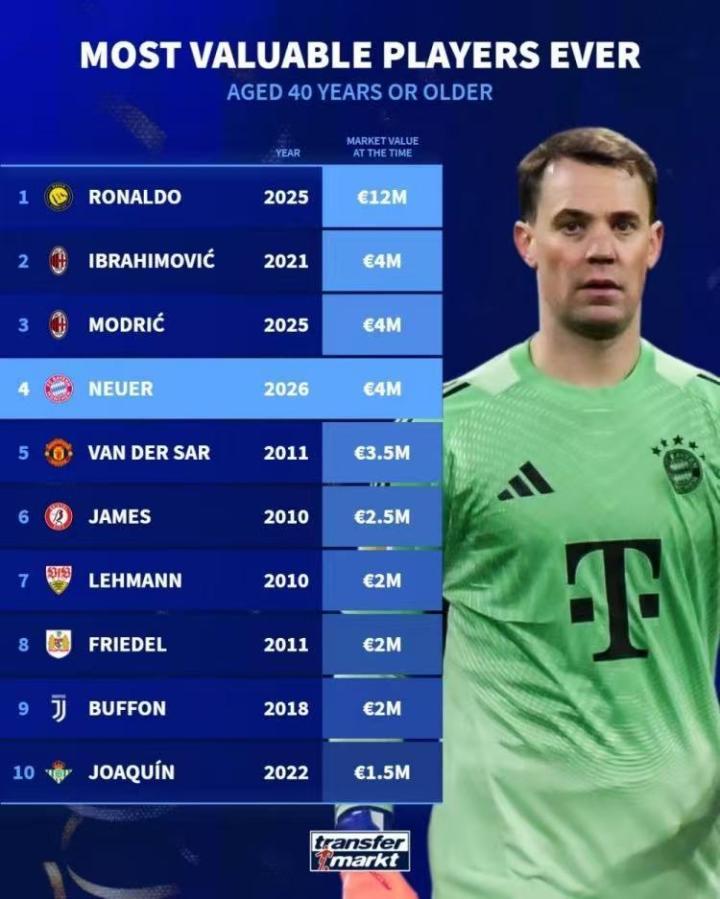 C罗=莫德里奇 诺伊尔 伊布!最近,德国传奇门将诺伊尔刚过40岁生日,德转趁机更新了40岁及以上球员的身价榜,C罗依然稳居榜首。