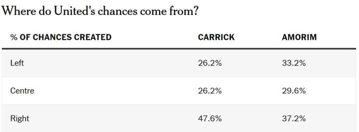 因此,曼联从右路创造的机会占比大幅上升——阿莫林时期左右路机会占比大致均衡,而卡里克执教后,右路机会占比达到48%。