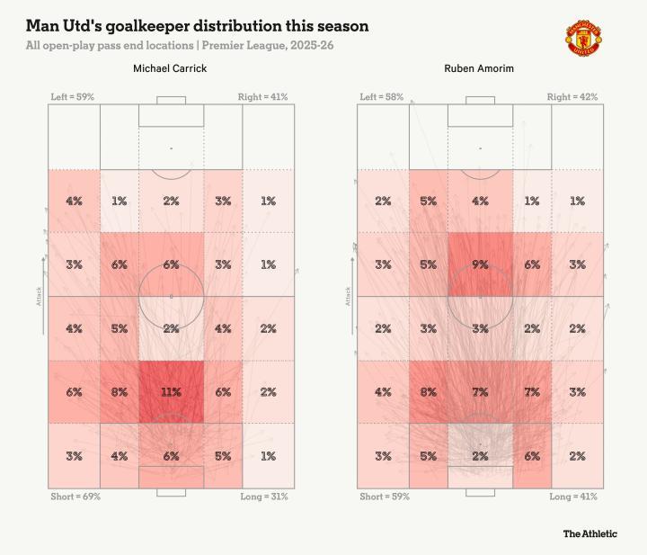 考虑到尽管谢什科状态不俗,但姆伯莫基本是卡里克首选的中锋,这一变化或许在意料之中。这也可能解释了为何在阿莫林执教末期,拉门斯的长传(曼联战术的关键组成部分)在卡里克时期也有所减少。
