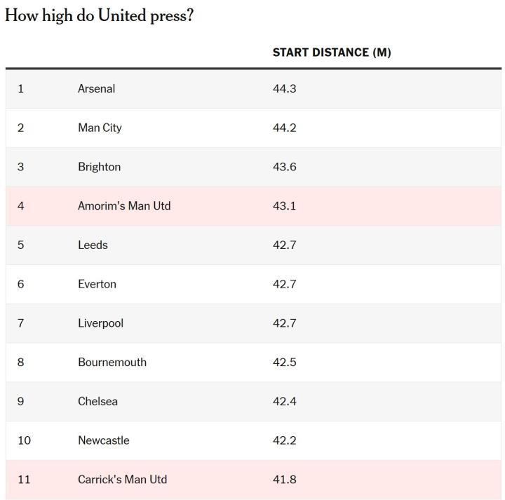 曼联压迫时的平均起始距离从43.1米降至41.8米。单看这一原始数据,差异似乎不大,但与联赛其他球队相比,这一变化更为明显。